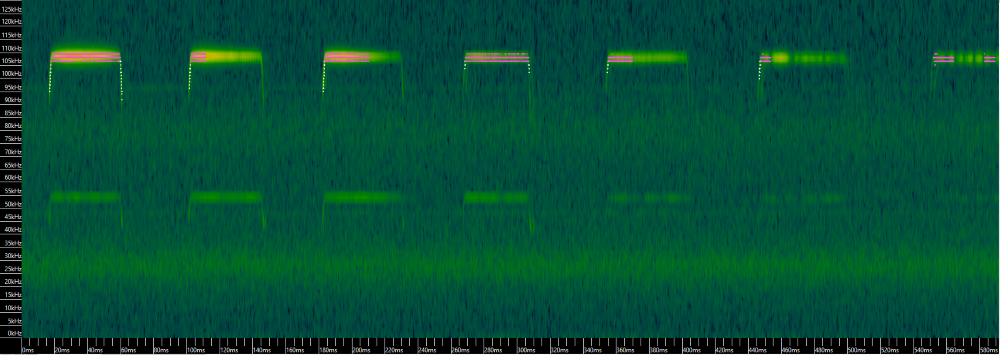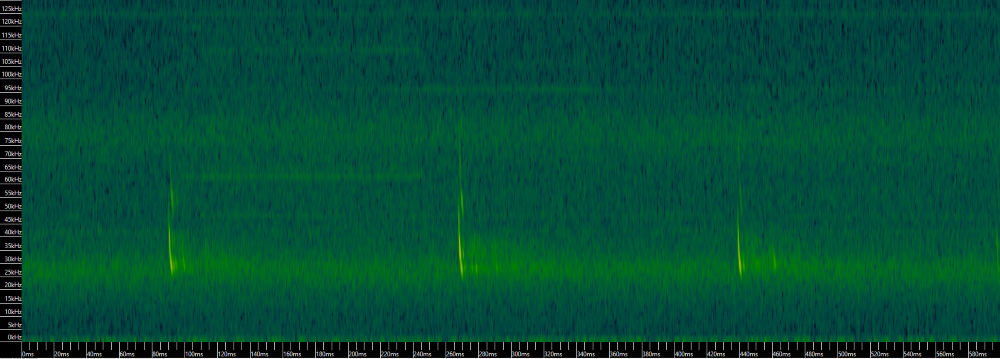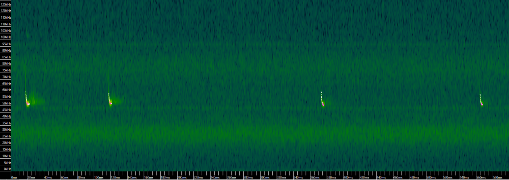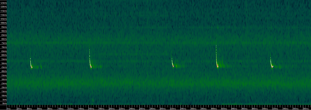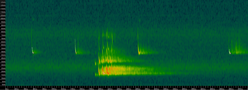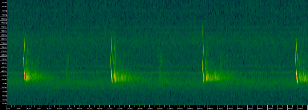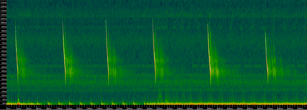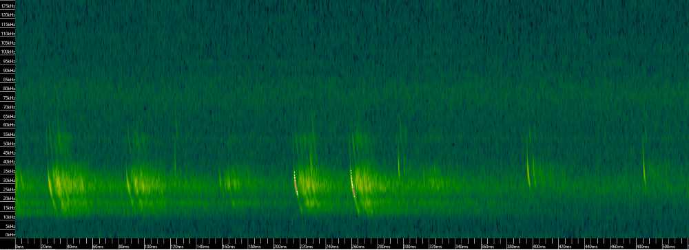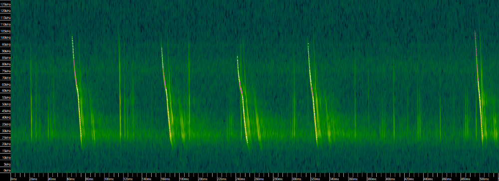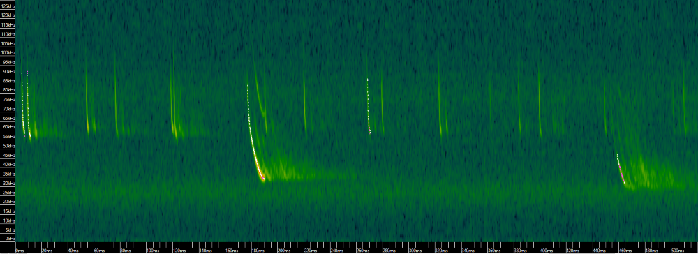 Bats make many different kinds of sounds. The sonograms above are the search calls of bats, and these are emitted whilst bats are flying around exploring their area and understanding what’s nearby. So you can picture a bat leaving its roost and flying in the church interior before going out for dinner, making these kinds of calls.